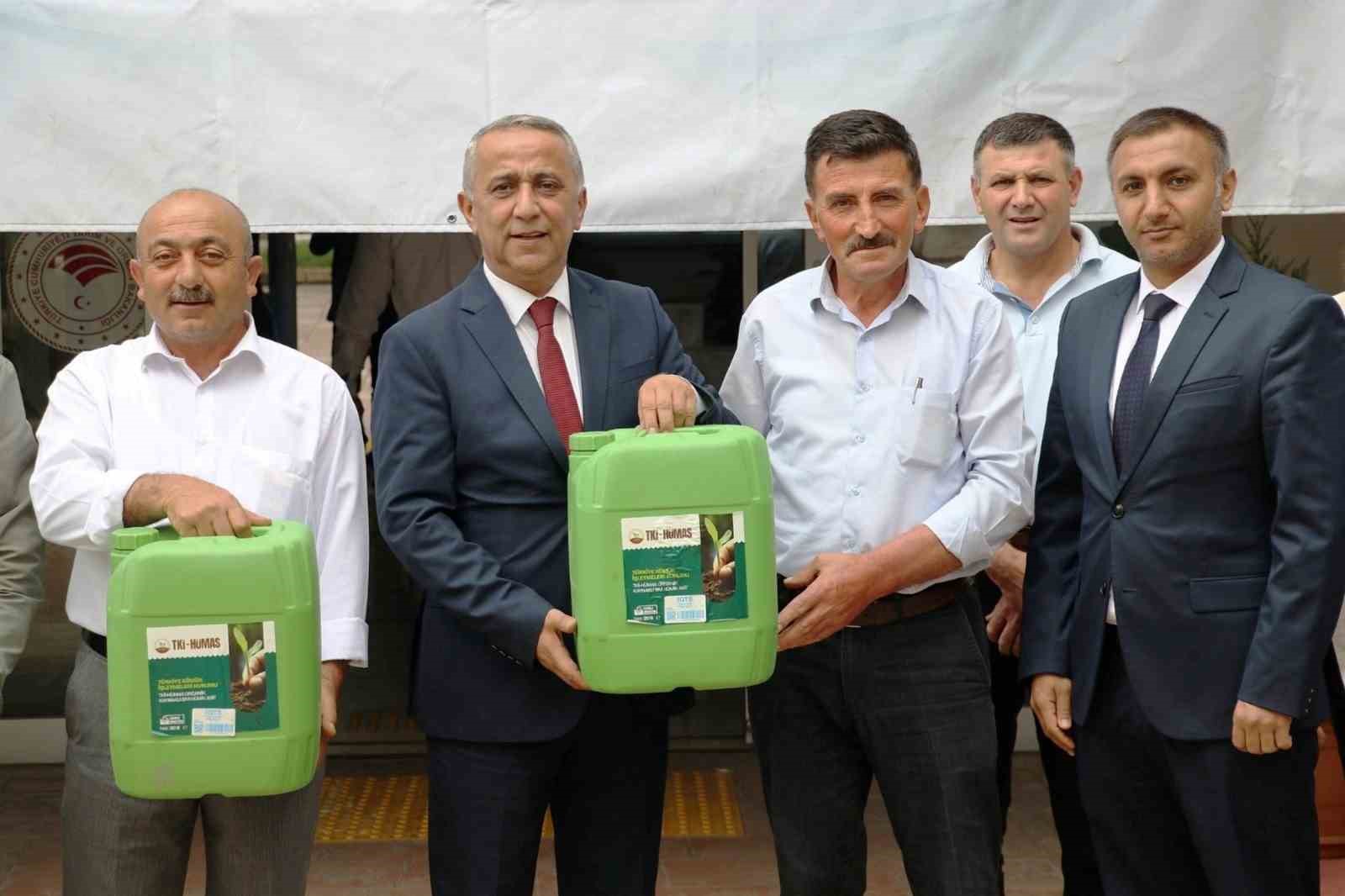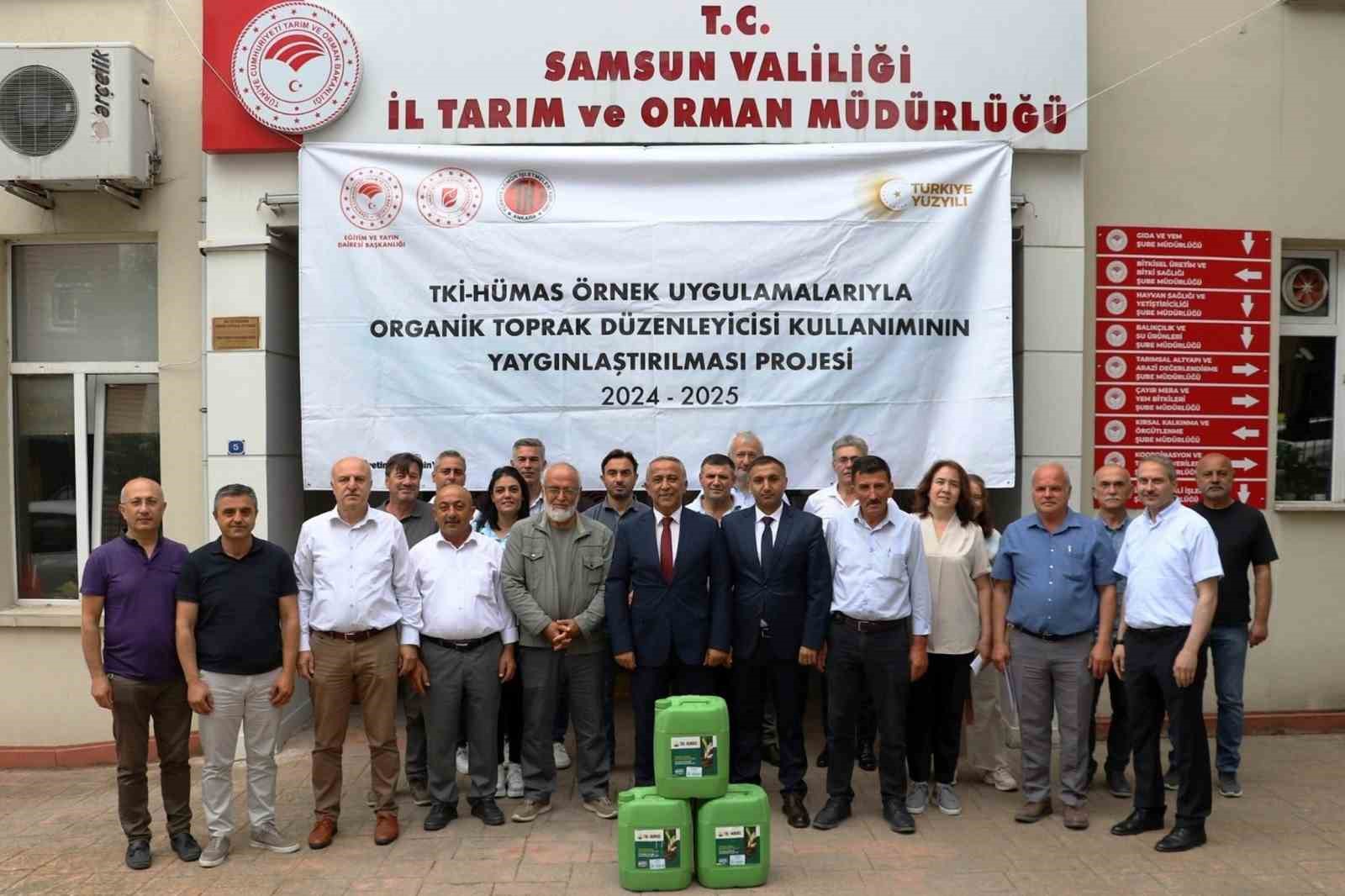 TKİ-Hümas Örnek Uygulamalarıyla Organik Toprak Düzenleyicisi Kullanımının Yaygınlaştırılması İşbirliği Protokolü kapsamında, Samsun çiftçilerine sıvı hümik asit (TKİ-Hümas) dağıtımı gerçekleştirildi. Konu hakkında bilgi veren Müdür Sağlam, “Proje kapsamında Bafra, Çarşamba, Terme, Kavak ve Havza ilçelerimizde belirlenen 11 üreticimize toplam 740 litre TKİ-Hümas dağıtıldı. 109 dekar alanda gerçekleştirilecek uygulamalarda, ceviz, aronya, kivi, buğday, çeltik, soya şekerpancarı, kenevir ve kavak ekili alanlarda hayata geçirilerek, proje ile çiftçilerin doğal ve sürdürülebilir tarım uygulamalarına teşvik edilmesi, toprak sağlığının korunması ve verimliliğin artırılması hedeflenmektedir” şeklinde konuştu.