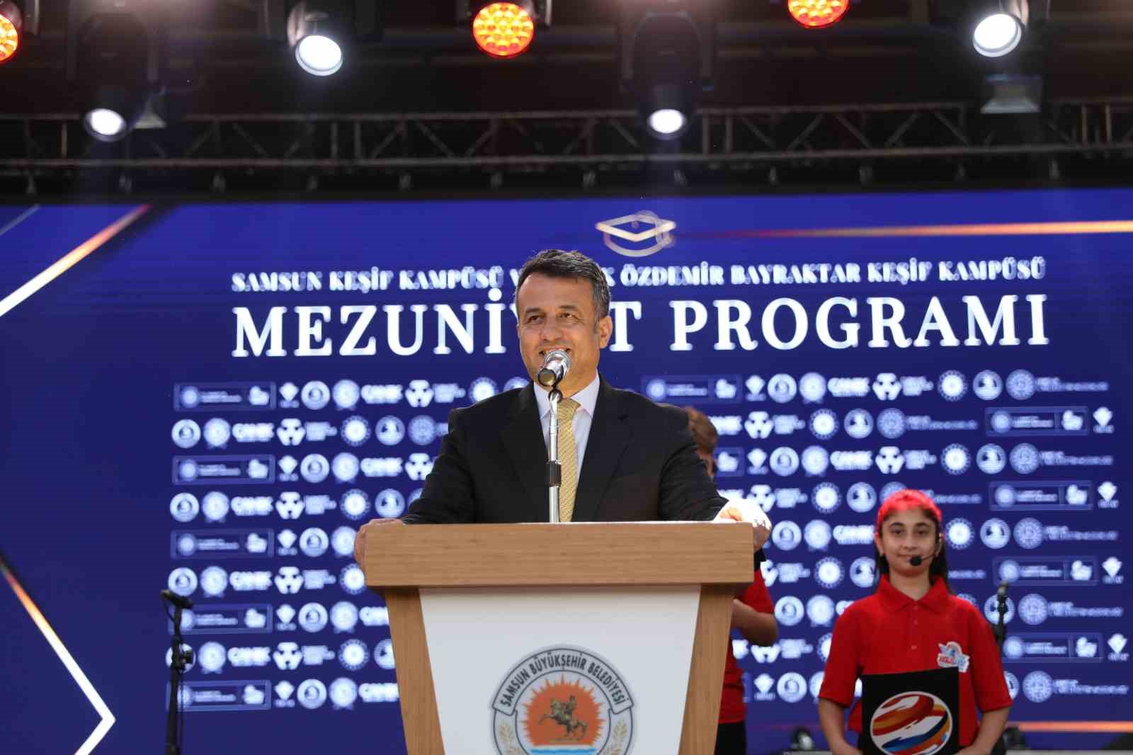 Samsun Büyükşehir Belediye Başkanı Halit Doğan, keşif kampüslerinin ilk mezuniyet töreninin tarihi bir başlangıç olduğunu belirterek, öğrencilerin her zaman yanında olduklarını kaydetti. Başkan Doğan, “Bugün burada yalnızca bir mezuniyet töreni gerçekleştirmiyoruz, aynı zamanda bir vizyonun hayat buluşuna tanıklık ediyoruz. Sizler bu yolun öncülerisiniz. İlk mezunlar olarak Samsun’un tarihine adınızı yazdırıyorsunuz. Hayal ettikçe şehrimiz ve ülkemiz yükselecek. Tıpkı dron takımlarımızın TEKNOFEST’te elde ettiği başarı gibi, sizler de ulusal ve uluslararası arenalarda Samsun’umuzun adını gururla temsil edeceksiniz. Türkiye Yüzyılı vizyonu, siz gençlerin attığı bu adımlarla şekillenecek. Bilim ve teknoloji yolculuğunuzda hep yanınızda olacağız” diye konuştu.
