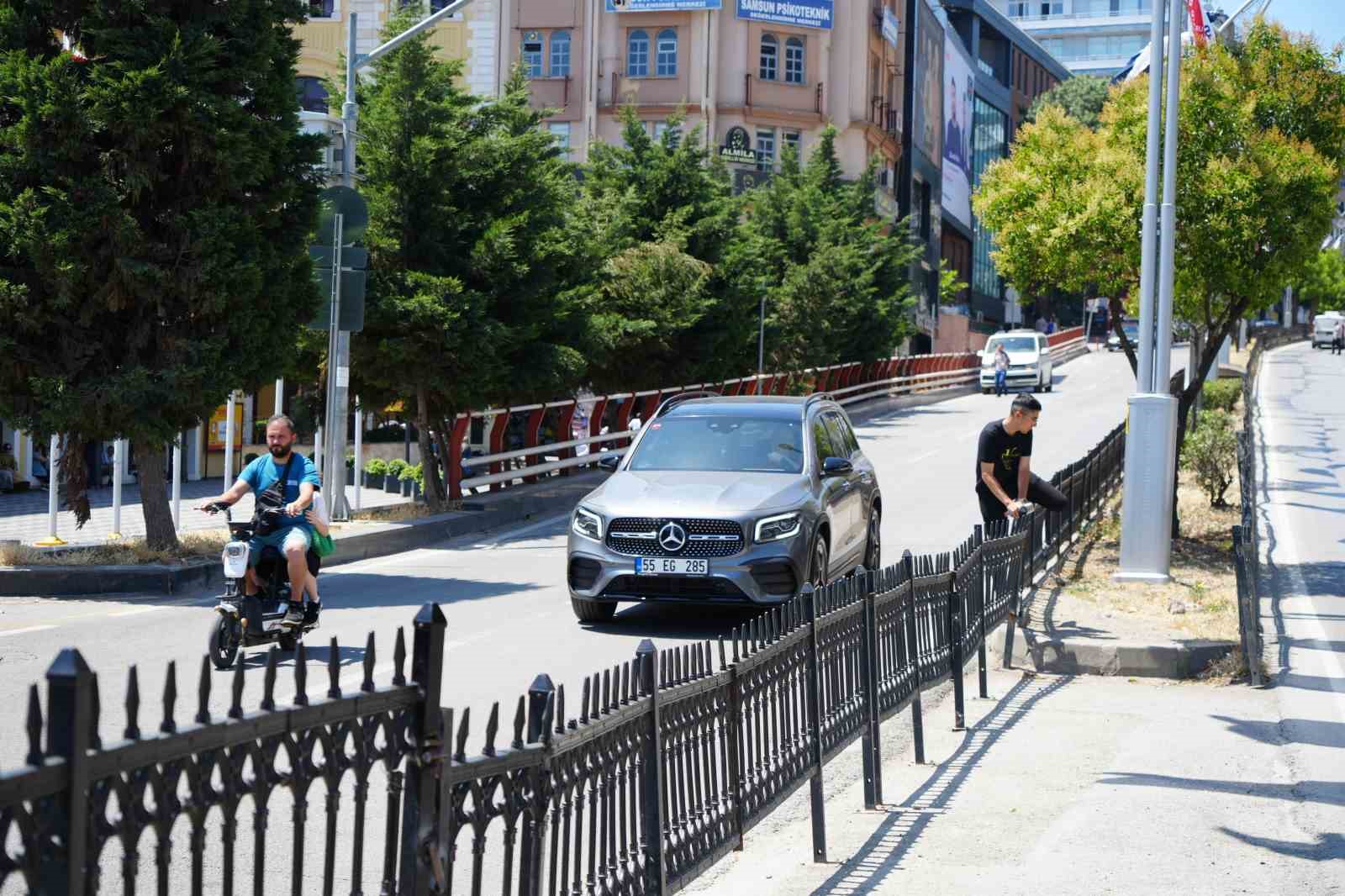 Samsun’un en işlek arterlerinden biri olan 19 Mayıs Bulvarı’nda onarılan bariyerlere rağmen bazı yayalar, 90 ve 140 metre mesafedeki yaya geçitlerini kullanmak yerine, trafiğin yoğun olduğu yolda demir bariyerleri aşarak geçmeye devam ediyor.