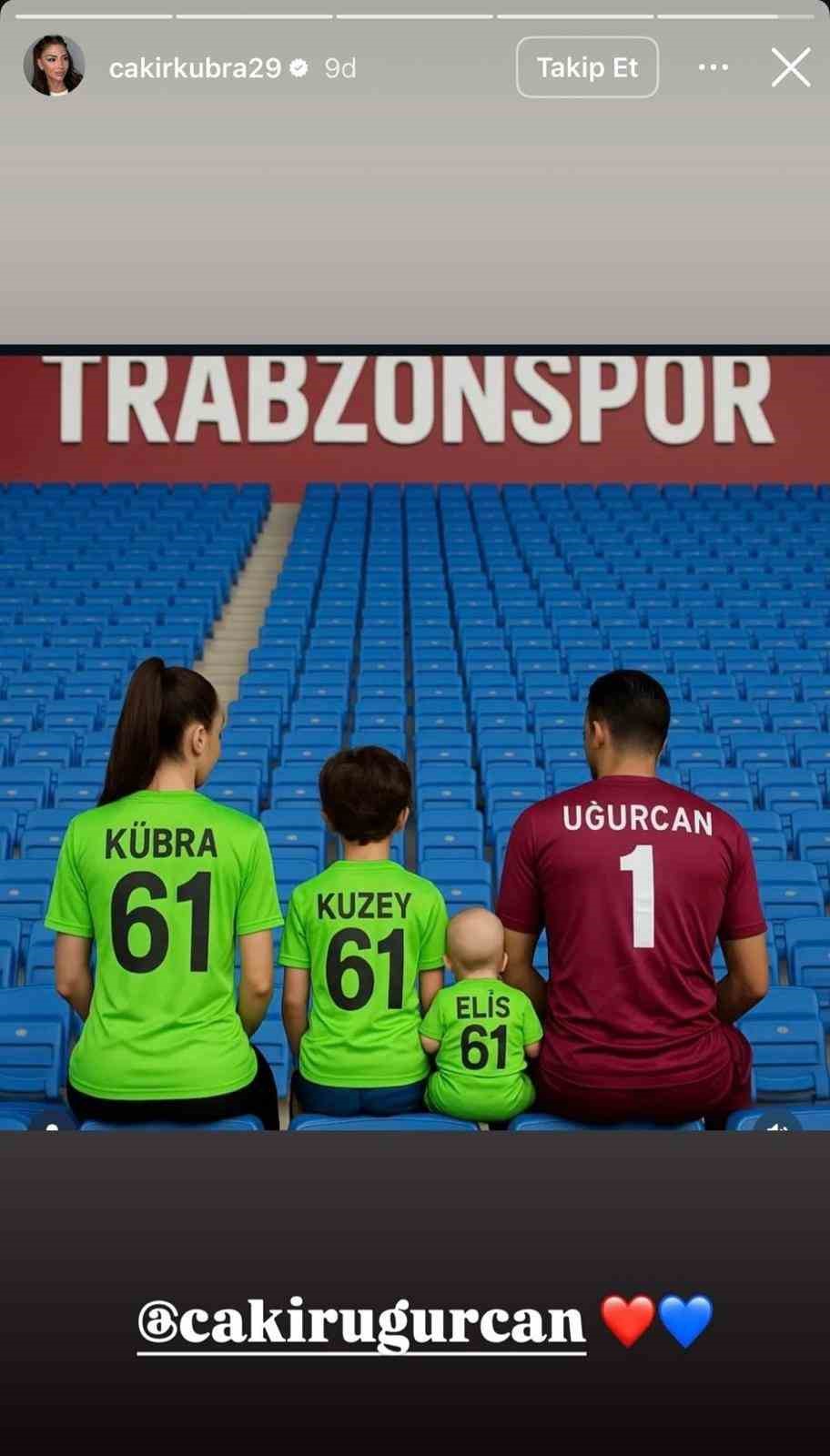 Trabzonspor’un file bekçisi Uğurcan Çakır, bordo-mavili ekibin 2021-2022 sezonundaki Süper Lig şampiyonluğunda kazandığı kupayla çekildiği fotoğrafı paylaşarak, kulübe olan bağlılığını görsel bir mesajla ifade etti. Paylaşım sadece Uğurcan’la sınırlı kalmadı. Eşi Kübra Çakır da sosyal medya hesabından çocukları Kuzey ve Elis ile birlikte yer aldıkları, üzerlerinde Trabzonspor forması bulunan bir aile fotoğrafını yayımladı.