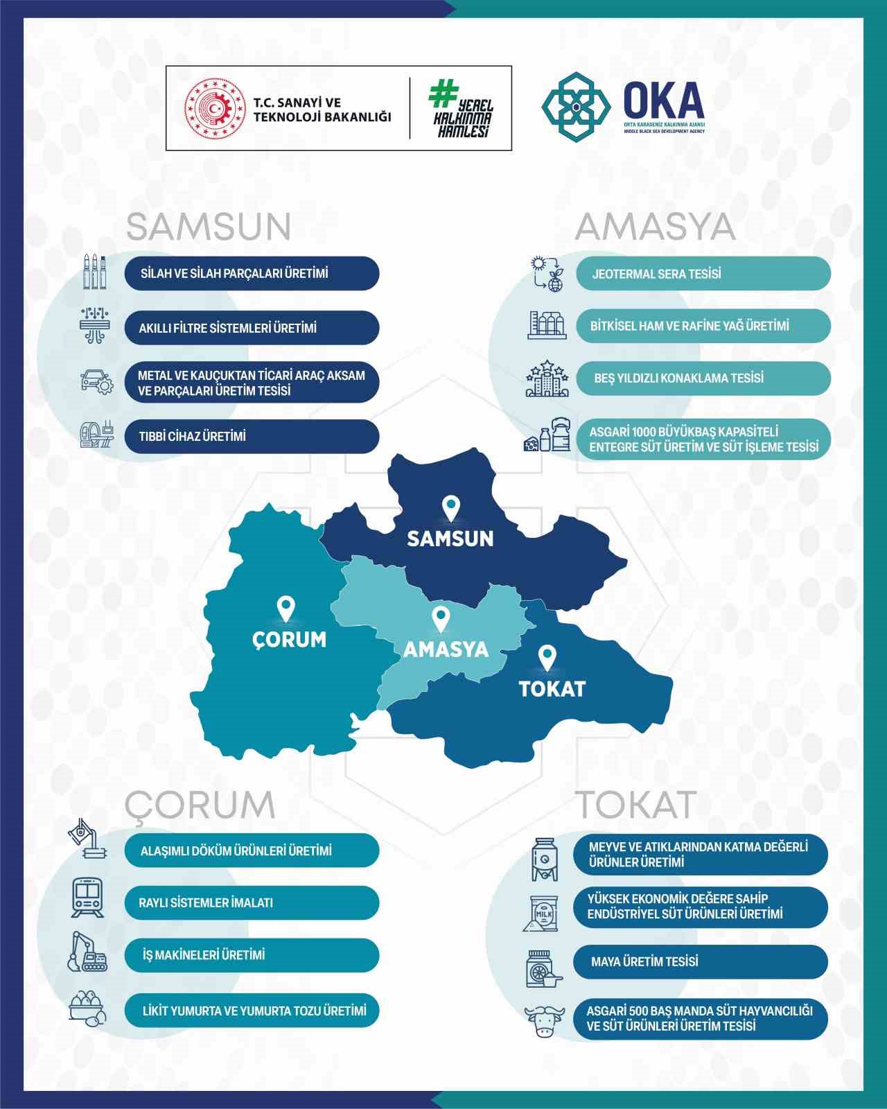 Amasya: Jeotermal sera tesisi, bitkisel ham ve rafine yağ üretimi, beş yıldızlı konaklama tesisi, asgari 1000 büyükbaş kapasiteli entegre süt üretim ve süt işleme tesisi.
