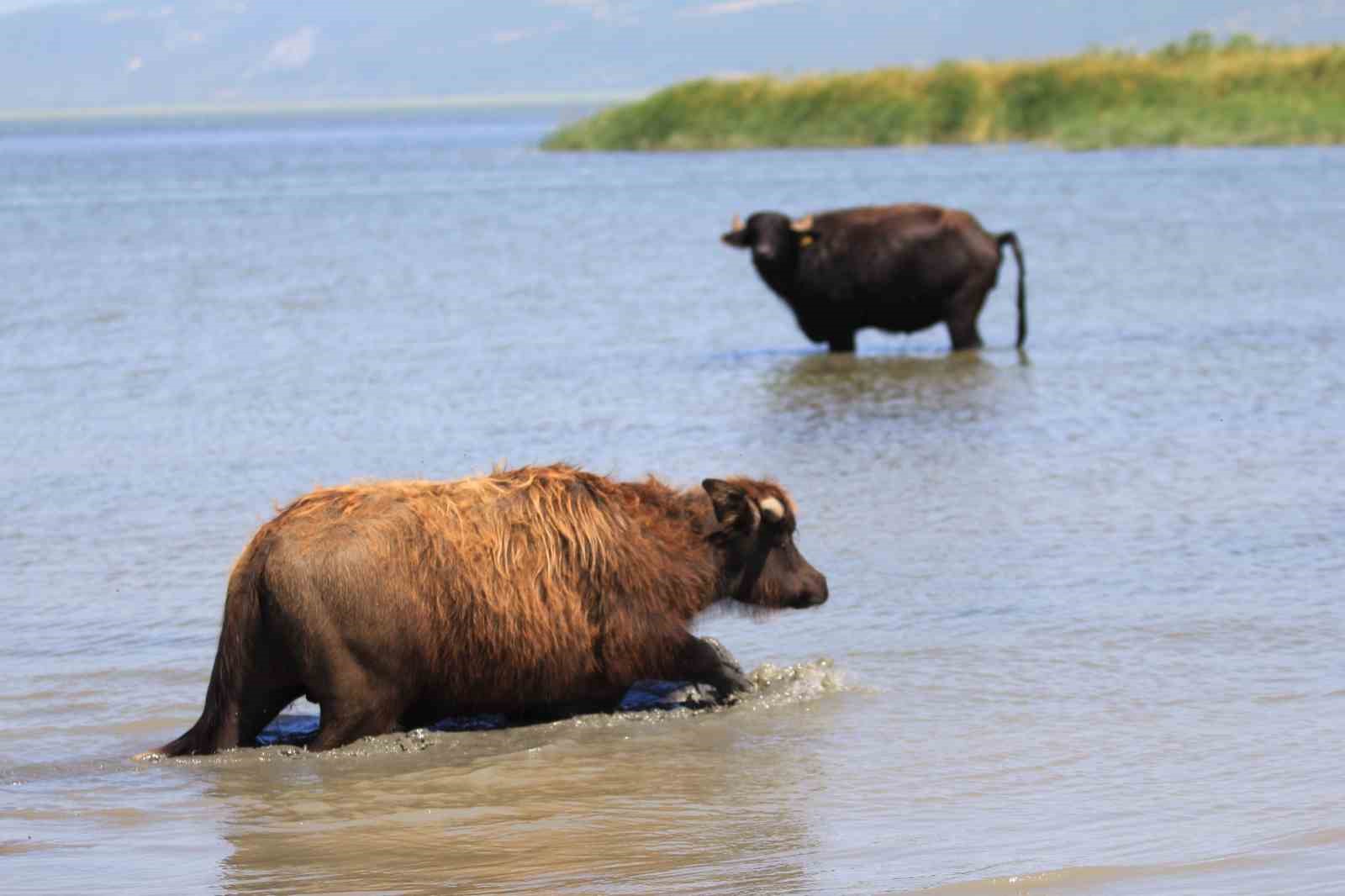 Bursa’nın Mustafakemalpaşa ilçesinin Uluabat Gölü’ne kıyısı bulunan kırsal Karaoğlan Mahallesi’nde mandalar yılın her döneminde suya girerek hem serinliyor, hem parazitlerinden arınıyor, hem de süt verimi artıyor.