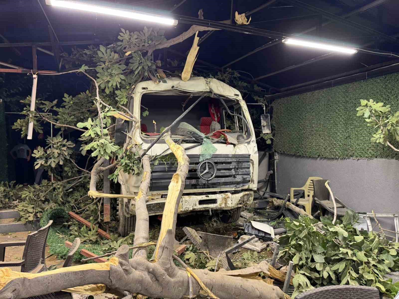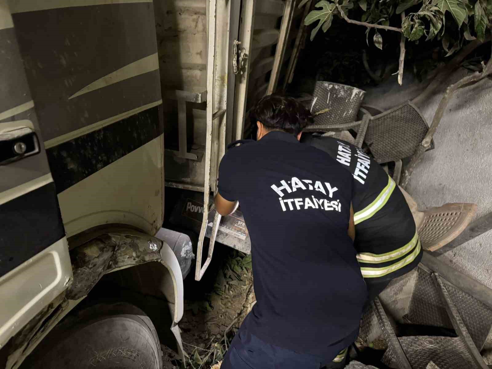 Hatay’da sürücüsünün kontrolünü kaybettiği demir yüklü kamyon restoranın bahçesine uçtu. Kazada sürücü ve 1 müşteri yaralandı.