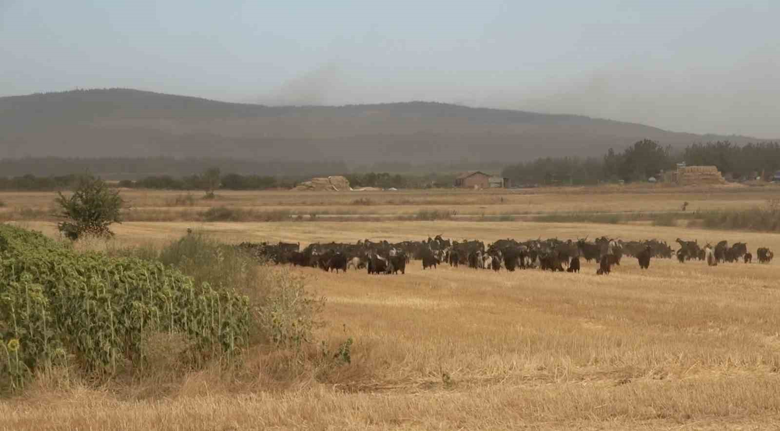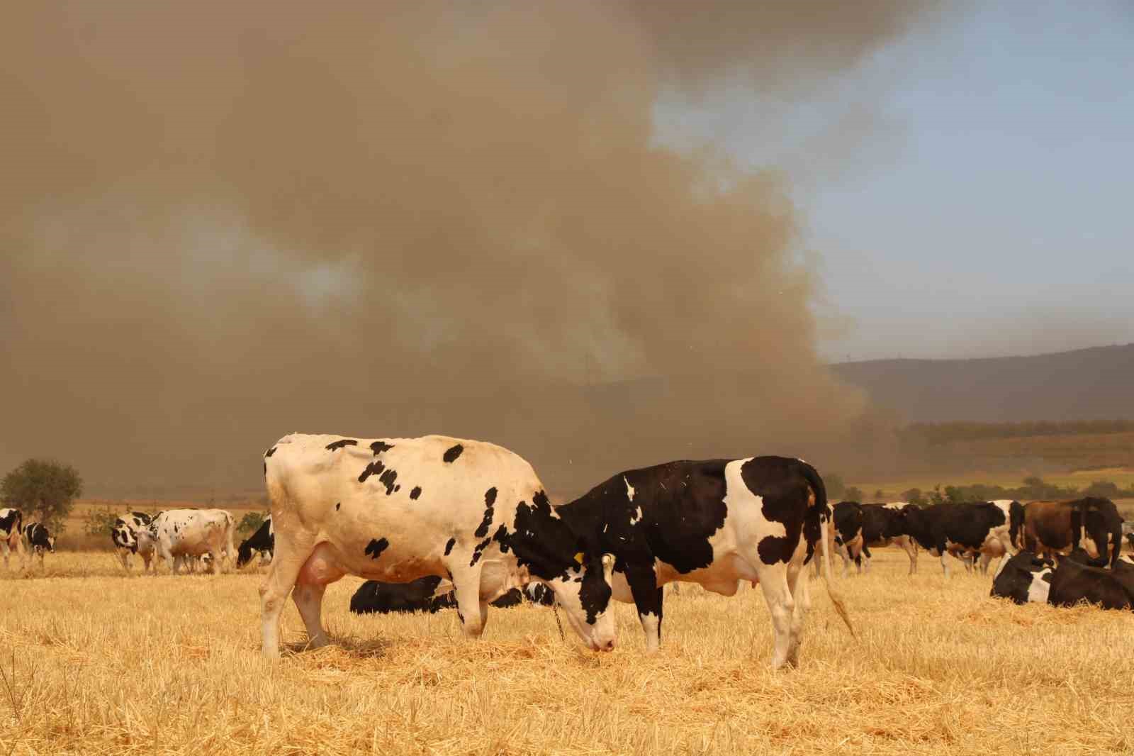 Tekirdağ Şarköy’de dün başlayan ve Çanakkale’nin Gelibolu ilçesi sınırlarında devam orman yangınında Kavakköy yakınlarında hayvan damları ve çiftlikleri olan küçükbaş ve büyükbaş hayvan sahipleri hayvanlarını yangından korumak için tarlalarda bekletiyor.