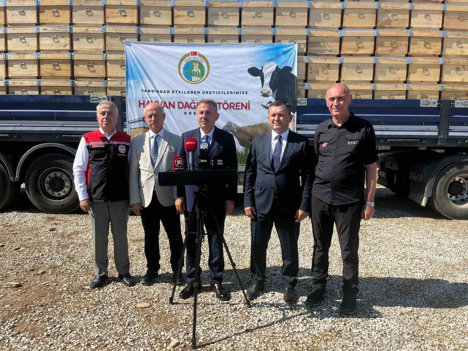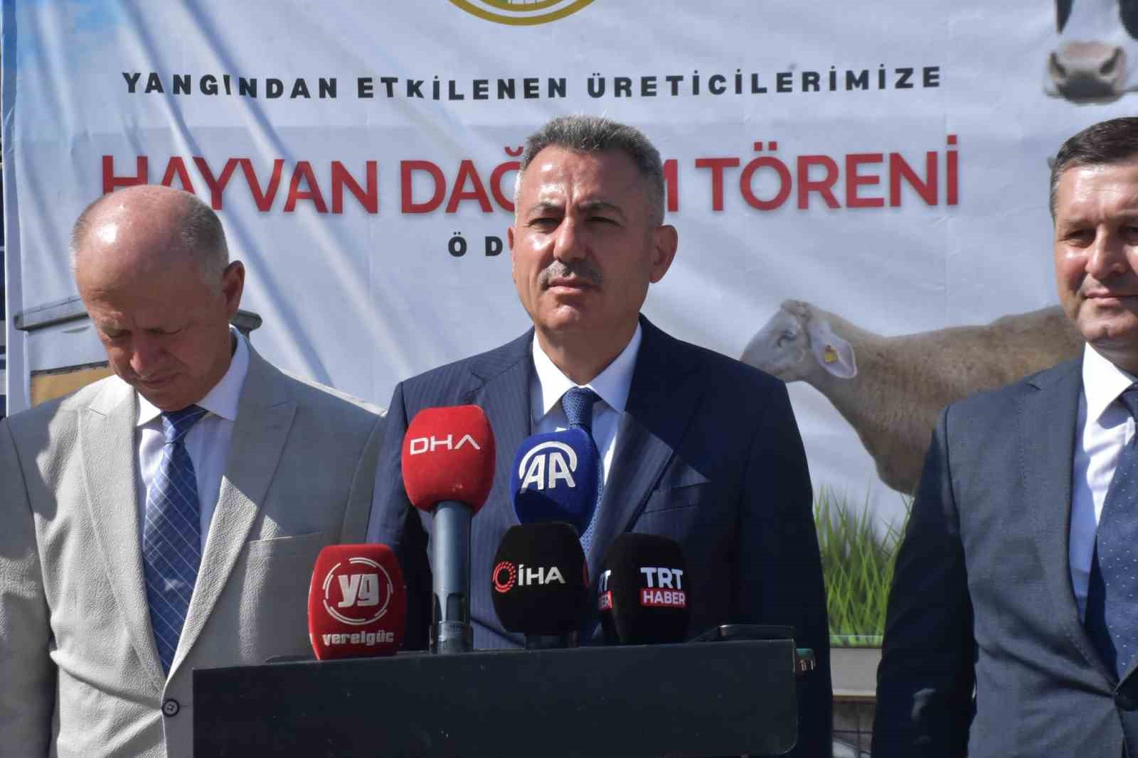 İzmir’in Ödemiş ilçesinde çıkan yangında hayvanları ve arı kovanları zarar gören vatandaşlar için İzmir Valiliğince “Hayvan Dağıtım Töreni” düzenlendi. İzmir Valisi Süleyman Elban, “Ödemiş’te telef olan hayvanları ve arı kovanlarını birkaç gün içerisinde tamamen teslim etmiş olacağız” dedi.