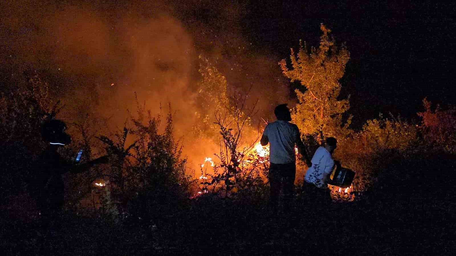 Karabük’te alevlere teslim olan ve yerleşim yerlerine sıçrayan yangında bir evin yakınındaki alevleri gören gençler kovalarla müdahale etti.