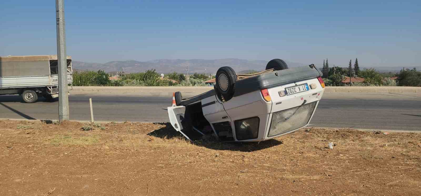 Hatay’ın Hassa ilçesinde tırla çarpışarak, takla atan ve ters dönen otomobilin sürücüsü yaralandı.