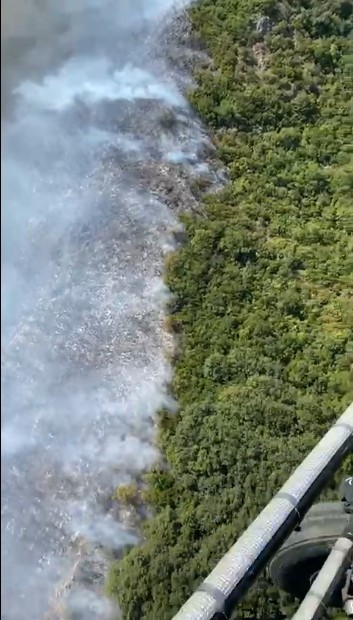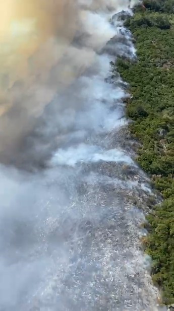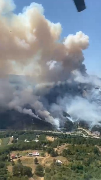 Yangın söndürme çalışmalarında görev alan helikopterden çekilen görüntülerde, yanan alanlar yoğun şekilde gözler önüne serildi.