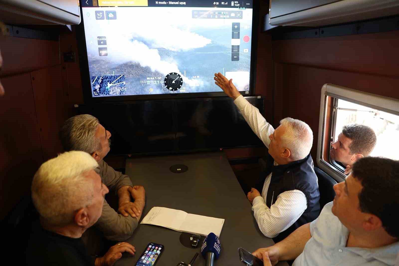 Bursa’nın Orhaneli-Harmancık ilçeleri arasında dün akşam saatlerinde başlayan ve kısmen kontrol altına alınan orman yangını, rüzgar sebebiyle bugün de etkisini sürdürüyor. Bursa Büyükşehir Belediye Başkanı Mustafa Bozbey, beraberindeki CHP İl Başkanı Nihat Yeşiltaş ve CHP Bursa Milletvekili Hasan Öztürk ile birlikte Harmancık ilçesine geçerek yangınla mücadele çalışmalarını yerinde inceledi. Orhaneli Belediye Başkanı Ali Osman Tayır ve Keles Belediye Başkanı Ali Doğru ile bir araya gelen Başkan Mustafa Bozbey, son durum hakkında fikir alışverişinde bulundu. Daha sonra AKOM aracına geçen Başkan Bozbey ve beraberindekiler, drone aracılığıyla alanı gözlemleyerek durum değerlendirmesi yaptı.