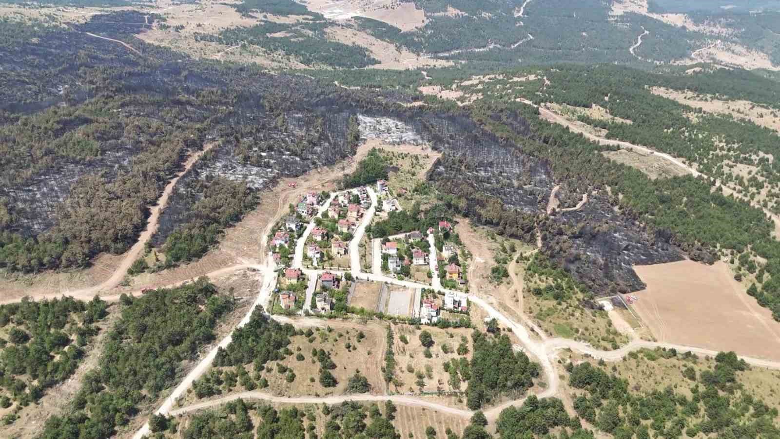 Karabük’ün merkez ilçesine bağlı Kahyalar Köyü yakınlarında çıkan orman yangını nedeniyle büyük tehlike atlatan villalar dronla görüntülendi.