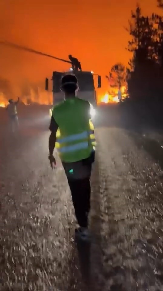 Geceyi aydınlatan alevler, biranda yön değiştirmesi mücadeleye katılanlara da korku dolu anlar yaşatıyor. İzleyenlerin yüreğini ağzına getirdiği anlar ise cep telefonu kameralarıyla saniye saniye kayda alındı.