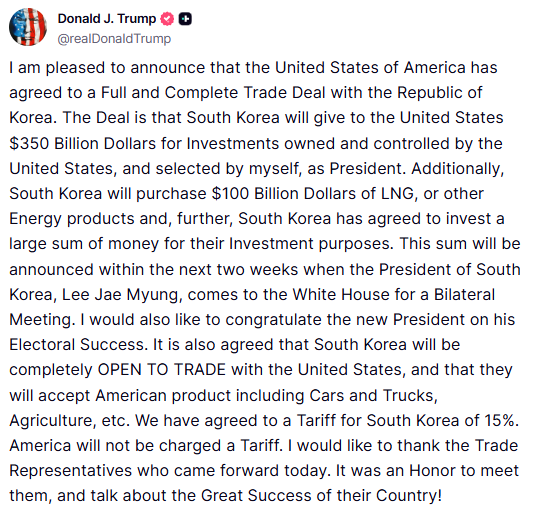 ABD Başkanı Donald Trump, Güney Kore ile “tam ve kapsamlı” bir ticaret anlaşmasına varıldığını duyurarak, “Güney Kore’ye yüzde 15’lik gümrük vergisi uygulanmasına karar verildi” açıklamasında bulundu.
