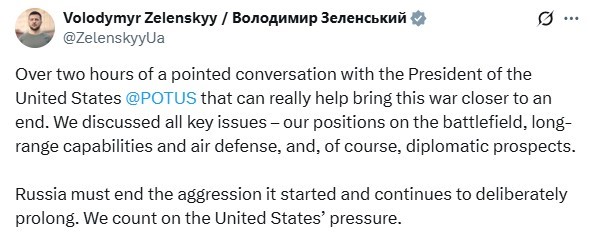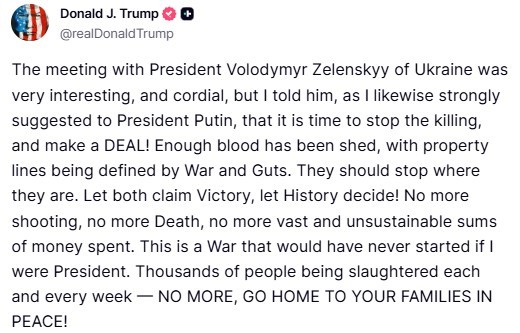 ABD Başkanı Donald Trump, Ukrayna Devlet Başkanı Vladimir Zelenskiy ile yaptığı görüşmenin ilginç ve samimi geçtiğini belirterek, “Ancak ona, daha önce Başkan Putin’e güçlü biçimde söylediğim gibi, artık öldürmeye son verme ve bir anlaşma yapma zamanının geldiğini söyledim. Bulundukları yerde durmalılar. Her iki taraf da zafer ilan etsin, kararı tarihe bırakalım!” açıklamasında bulundu.