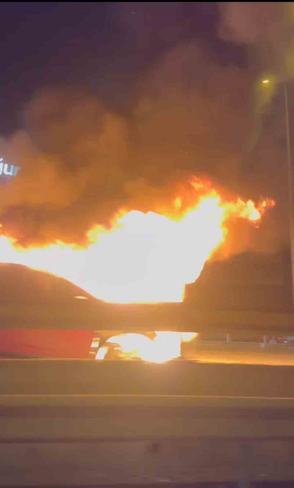 Pendik’te D100 Karayolunda seyir halindeki otomobil yandı. O anlar cep telefonu kamerasına yansıdı.